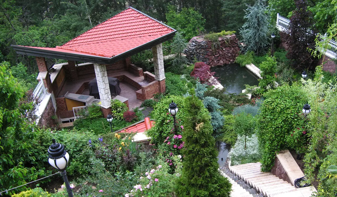 - قسمت های استراحت و نشیمن باغ: برای استراحت می توانید از انواع آلاچیق ها و سایه بان ها به همراه قسمت نشیمن و شومینه استفاده کنید.
