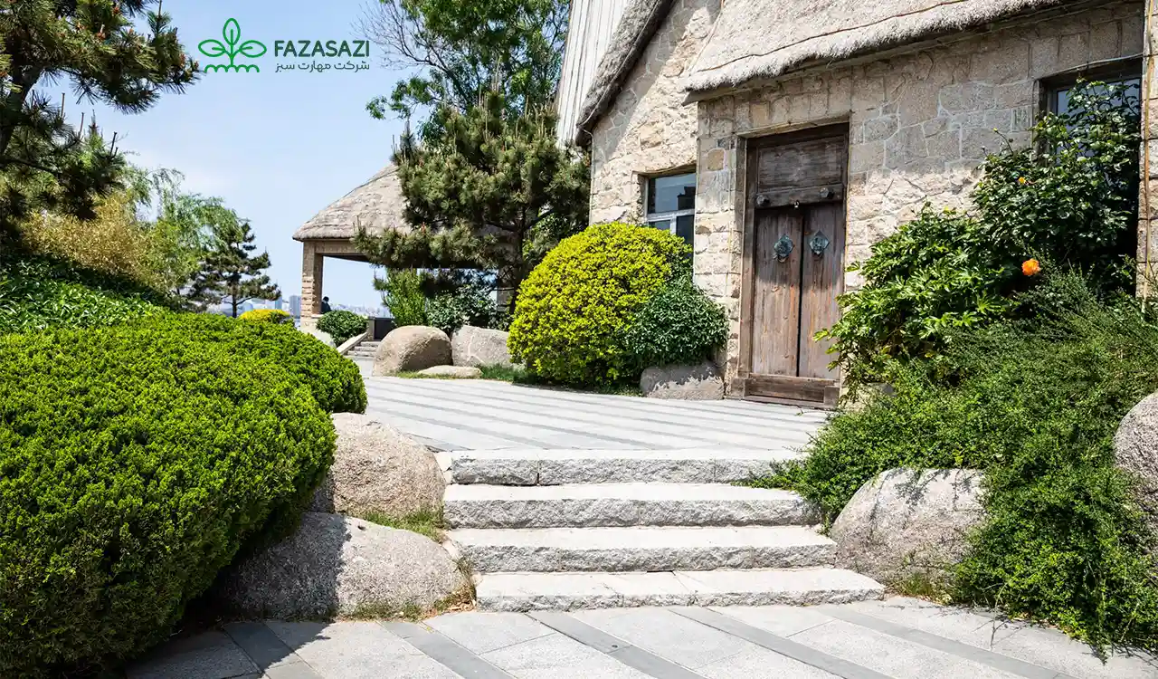 در باغ ویلایی کلاسیک، معمولاً متریال غالب سنگ است.